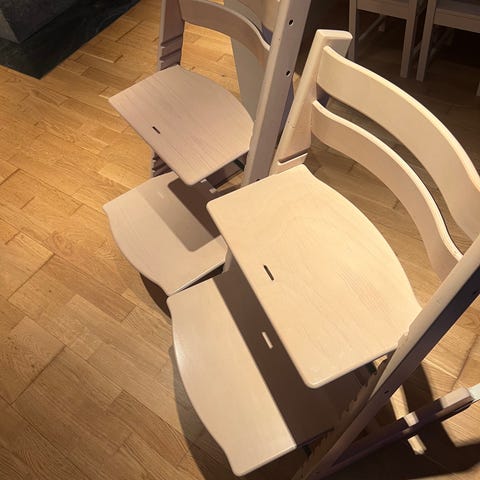 Stokke barnestol med småbarnsdel og bordplate, og ben i tre. Designet for barn, egnet til bruk ved måltider og aktiviteter.