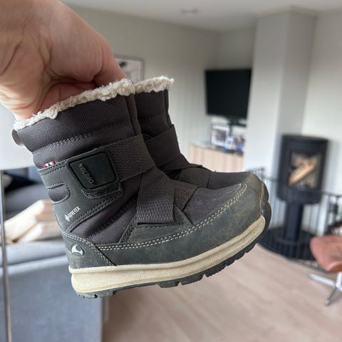 Viking vinterstøvler i størrelse 23. De har borrelås-lukking for enkel på- og avkledning samt godt grep i sålen. Pent brukt (men skrevet med penn på sålen - se bilde). Har ligget et par år i boden men klaffet ikke med str/sesong for lillebror.