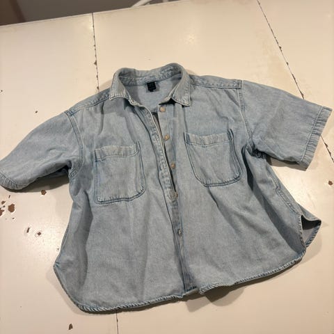 Skjorte i grå denim for dame i størrelse XL. Laget av denimmateriale, egnet som et ytterplagg eller lag-på-lag plagg.