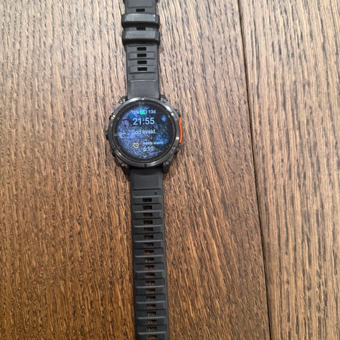 Garmin smartklokke for unisex. Klokken har en rund urskive og en svart rem. Egnet for daglig bruk og ulike aktiviteter. Eske og lader inkludert. Jeg kan sende kvittering på forespørsel.