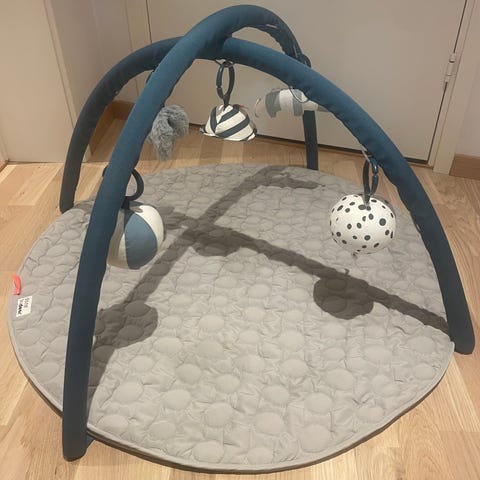 Done by Deer lekematte/ babygym i grå og blå farge. Rund matte med myk polstring og to kryssende buer som festes til matten. Inkluderer 5 hengende leker med bl.a. speil og bjelle. Buene har mange punkter for oppheng. Kan enkelt pakkes sammen, originalemballasje følger med.