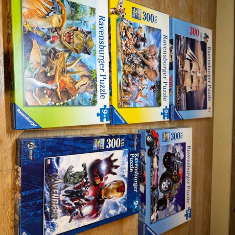 5 ulike puslespill med 1000 brikker hver. Kan selges sammen eller alene.