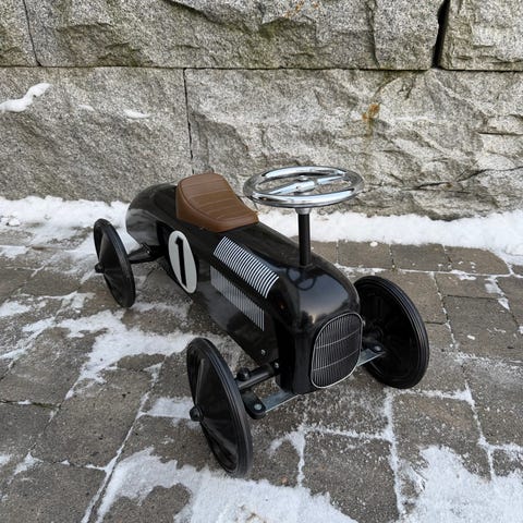 Morsom sparkebil/gåbil med Lynet McQueen fra Cars. Barnet sitter på og sparker seg frem med føttene. Har ratt og håndtak bak slik at voksen kan skyve.