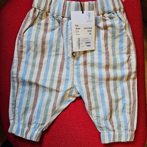 Hust & Claire bukse i størrelse 56, laget av bomull. Plagget har blå farge. Fikk nå til jul og brukt av ett barn. Han vokste ut av plagget ila to uker, så lite brukt.