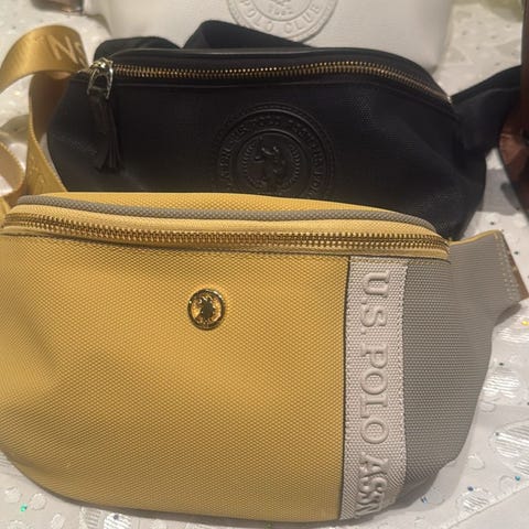 Stoff Skulderveske i beige farge, designet for unisex bruk. Vesken har justerbar skulderrem og flere lommer for oppbevaring av personlige eiendeler.