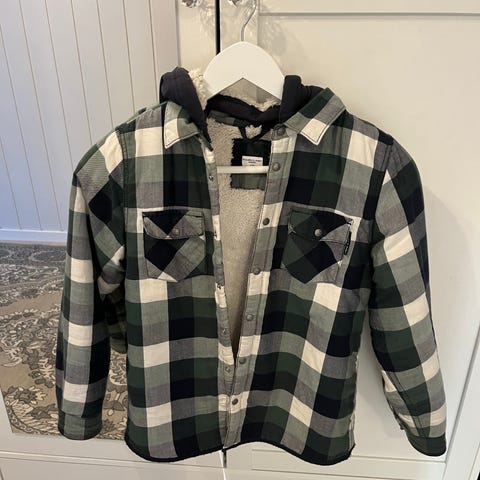 Vakker og varm collegejakke fra Polarn O. Pyret i størrelse 134. Avtagbar hette og veldig mykt stoff på innsiden.