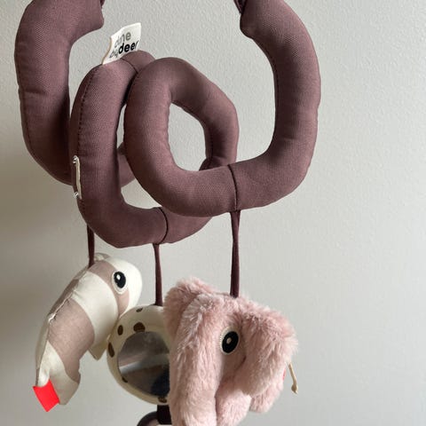 Morsom aktivitetsleke. Perfekte både til lek og kos. Kan festes til barnesengen, barnevognen eller bilstolen, med tråder. Har noen bruksmerker etter to barn og trenger en liten vask. Kan fint vaskes i vaskemaskin.