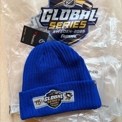 Sverige 2025 series between Crosby’s Pittsburgh and Forsberg’s Nashville in Stockholm. Sweden Blue toque with hockey logo patch on it and a Fanatics label. Match with your favorite NHL drakt.