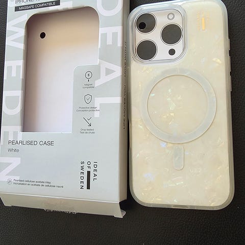 iDeal of Sweden Pearlsed Case for iPhone 16 Pro i hvit farge. Dekselet har en perlemorseffekt og er designet for å beskytte telefonen mot riper og støt.