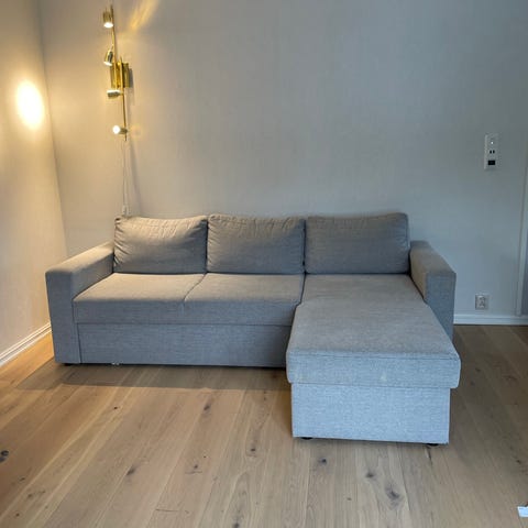 Sovesofa fra Amøbler til salgs. Grått stoff. Følger med lite brukt overmadrass fra Ikea.