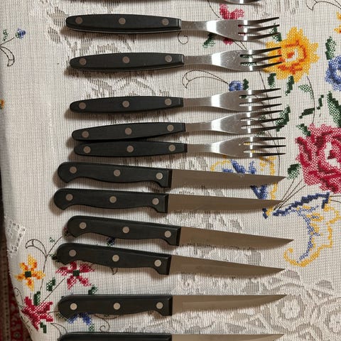 Biffbestikk til seks personer. Kun brukt en eller to ganger, men har ligget i en skuff i årevis og har noen flekker pga det. Ukjent merke, men står «made in Germany» på.