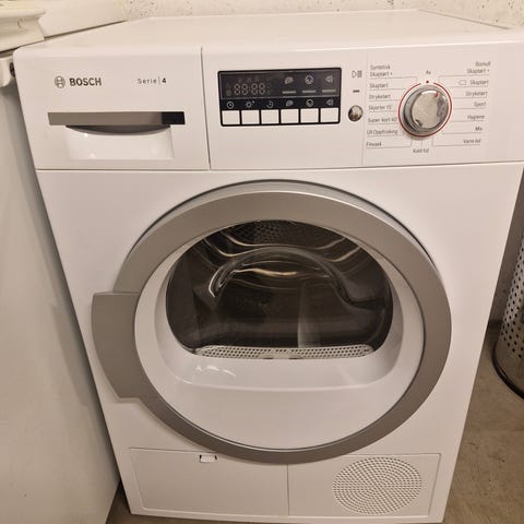 Bosch Maxx 7 kondens tørketrommel. Produktet er hvitt og har flere innstillinger for tørking, inkludert skaptørt, strykefritt og kok/kulørt. Tørketrommelen har en enkel betjening med en sentral dreiebryter for valg av program.