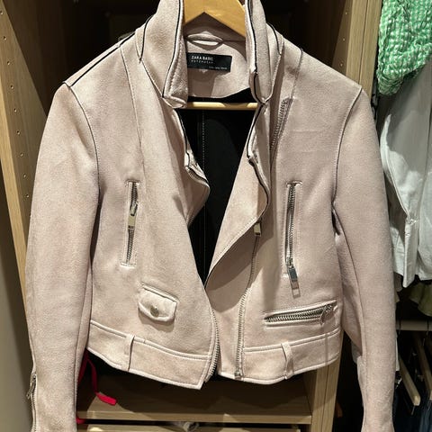 Zara skinn Annet yttertøy i svart farge, størrelse S for dame. Jakken er laget av skinn og har detaljer som glidelåser og belte.