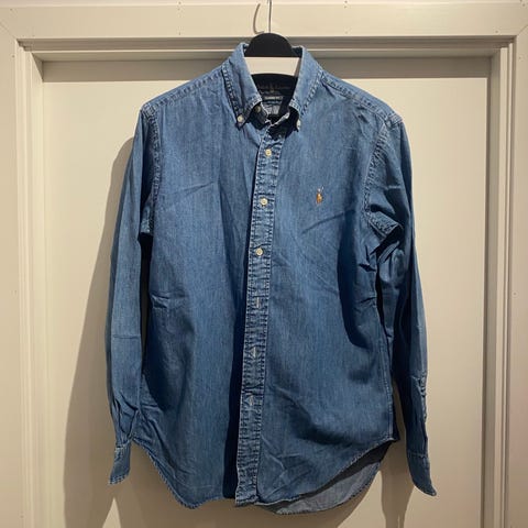 Slimfit. Ralph Lauren Denim skjorte i blå farge, størrelse M for herre. Laget av denim materiale. Skjorten har knappelukking og klassisk krage.