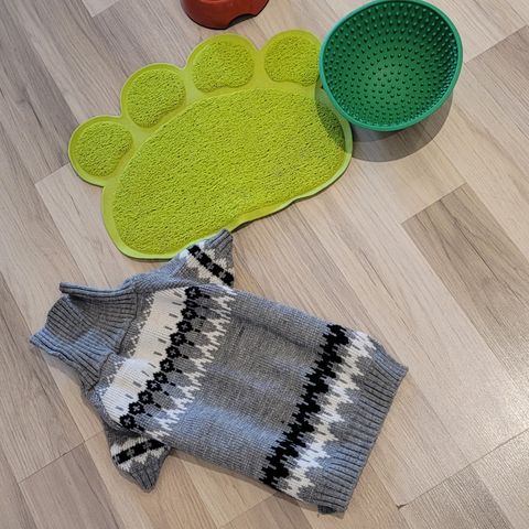 Håndstrikket hundegenser med mønster i blå og hvit. Str S. Genseren har en høy hals og åpninger for ben. Passer til små hunder. Ubrukt. Bilde 1 avviker litt fra mønsteret (bilde 2 og 3). Strikket i 100% norsk ull.