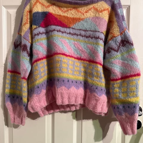 Hjemmestrikket genser i oversize modell. Strikket av kid silk i 2 tråd. Varm og stilig.