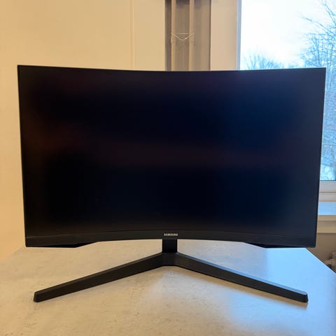 Samsung Odyssey G5 27 tommer skjerm med buet design. Skjermen er egnet for bruk til gaming og generell databruk.