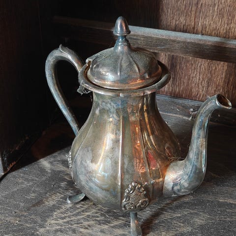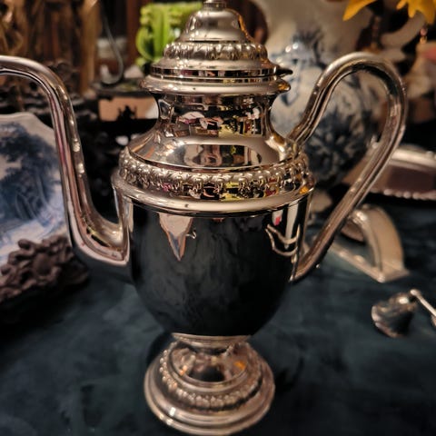 Kvalitets tekanne i sølvplett fra Atkin Brothers, Sheffield 1870 -90. Upusset og i meget god stand. Detaljerte dekorasjoner. Kanskje vært en bryllupsgave da to sett initialer er inngravert på siden? Høyde 16 cm, lengde med hank og tut 26 cm, diameter 11 cm.