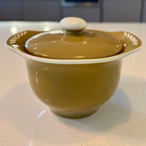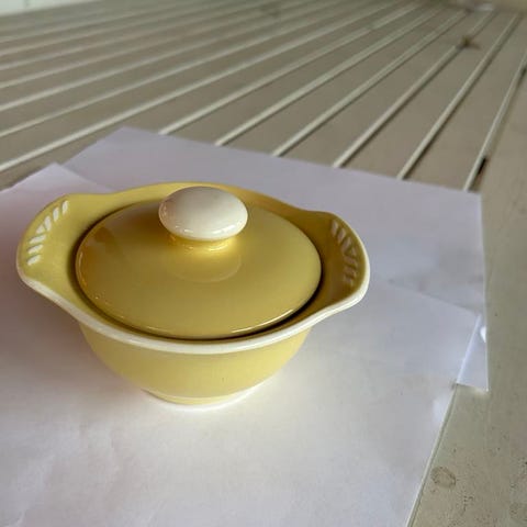 Lokket har misfarging på undersiden, og noen brune merker langs kanten på skålen, se bilder. Ellers i fin stand.