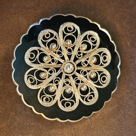 Dette er en brosje i oksidert sølv som forestiller en Tromsøpalmen, sannsynligvis laget av Sylvsmidja.