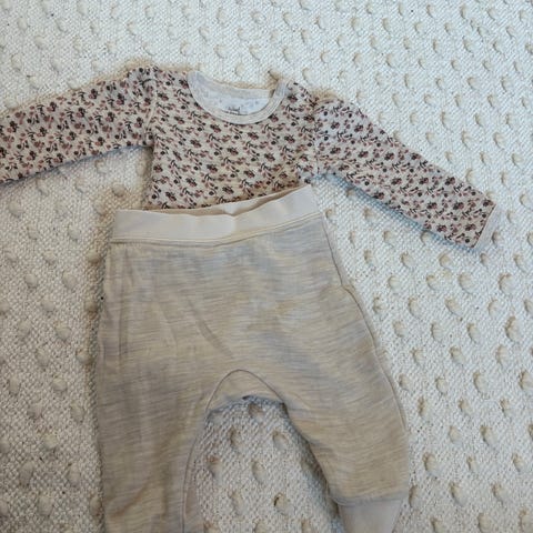 Klespakke som inneholder to par ullsokker, ullbalaclava, to bodyer fra hust & claire, ullsett med fot fra hust & claire (har en liten flekk på magen på bodyen og en flekk på kanten på buksa, regner med dette kan vaskes vekk), to bodyer fra reflex og en ulltights fra name it 🐑🐑 alle plaggene er pent og lite brukt, men kan være noen få nupper som enkelt fjernes med nuppefjerner dersom man ønsker det 😊