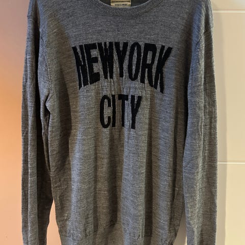 ullgenser i størrelse L for herre. Genseren er grå og laget av ullmateriale. Den har glidelås i front og stripete mønster på ermene.