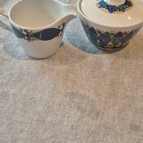 Stort vakkert kaffeservise fra fordums tid. Det er i fin stand. Ingen skår eller krakilering. Ørlite gullslitasje langs kant.
