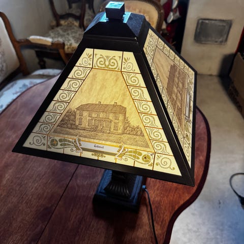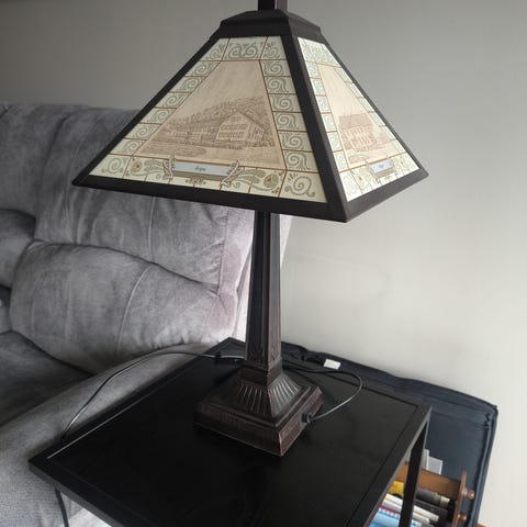 Selger 1 pent brukt bord lampe. Det er bilde motiv av Indre Arna kirke og Indre Arna brann stasjon og Gamle Arna stasjon ( pakkhuset) og Indre Arna Togstasjon. Lampen er av metall og lampeskjerm er av Glass og metall. Høyden på Lampen er 58 cm og lampe skjermen er 34cm. Lampen virker som den skal. Må Hentes og jeg sender IKKE. Må Hentes.