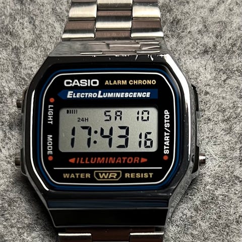 Casio A168 – klassisk digital klokke med gullfarget metall lenke. En enkel og stilren modell med digital skjerm som viser tid og dato, i tillegg til praktiske funksjoner som alarm, stoppeklokke og lys for å se skjermen i mørket.