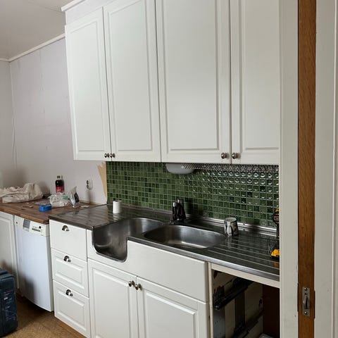 Kjøkkeninnredning med hvite skap og mørk benkeplate.