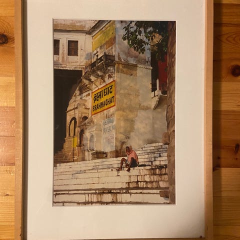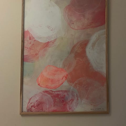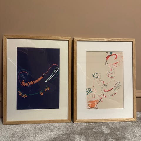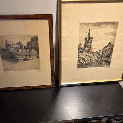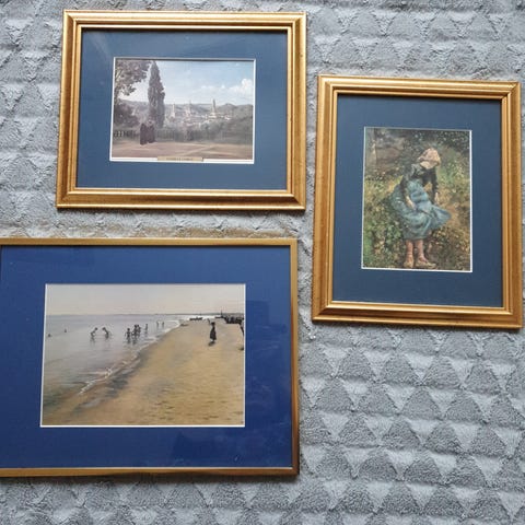 To innrammede kunsttrykk som viser mennesker i gult yttertøy og hatter, samt en hvit hund. Motivene inkluderer en person som går foran flere hus og en person med en hund. Rammene er i lys trefarge.