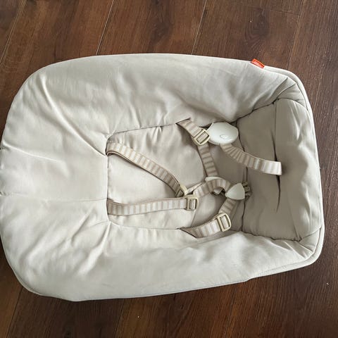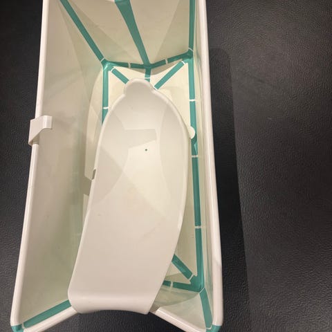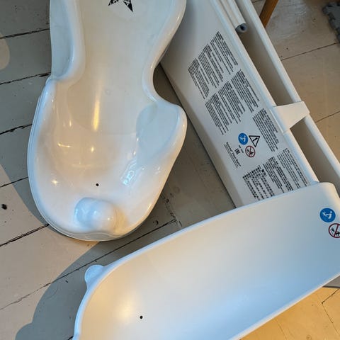 Selger et pent brukt stokke flexi badebalje med nyfødt sete og stativ i fargen hvit og gul.