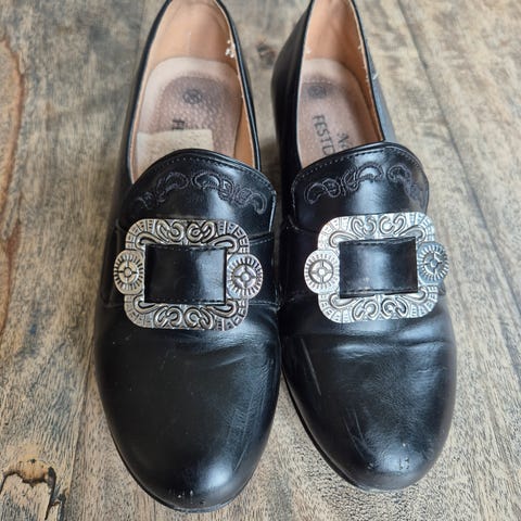 Flotte bunadsko fra Norsk Festdrakt str 34. Semsket skinn innersåle med myk demping, så behagelige på foten. Kan anbefales. Brukt kun en gang, så bare antydning til litt bruksmerker under hælen, ellers pene. Ca nesten 2 cm hæl.