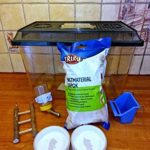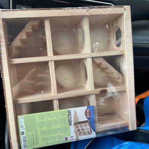 Følger med vannautomat, sandkasse, hjul i tre, leker, sovehus og labyrint, reisebur som har både skål og vannautomat og litt strø