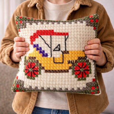 Håndbrodert duk/brikke i rosa stoff.
