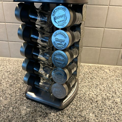 Pent brukt krydderstativ. Beholdere har magnet bakpå så det er enkelt å henge disse.