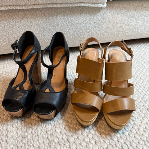 Selger ubrukte/lite brukt, høyhælte sko fra Nelly og platform-sandaler fra Steve Madden.