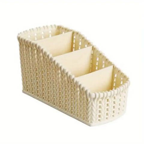 Roterende oppbevaringsboks laget av plast. Boksen har flere rom i forskjellige størrelser, egnet for organisering av små gjenstander som sminke, parfyme eller kontorrekvisita. Designet for enkel tilgang med roterende funksjon.
