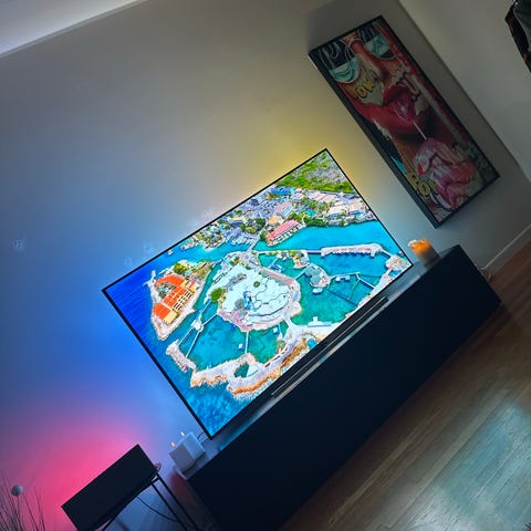 Lite til ingen tegn på bruk på skjermen. Veldig fin bildekvalitet med Ambi Light. HDR 10 og Dolbyvision og Dolby Atmos. TV-veggfeste og TV-stativ inkludert. Veggfestet er fra Vogel og støtter 100" TV og tåler en vekt på 100 kg.