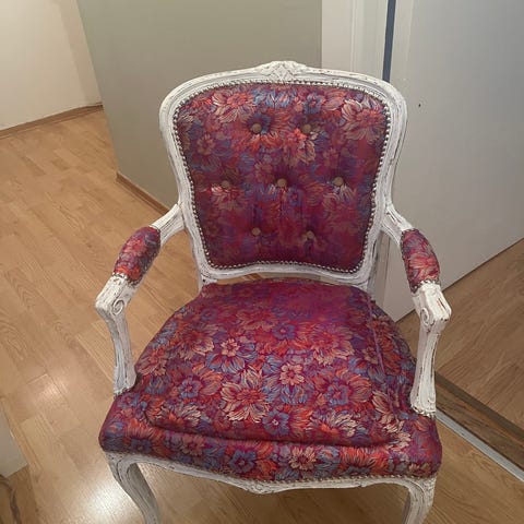 Antikk Lenestol med brodert stoff og treramme, vurderes solgt