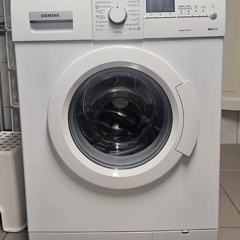 Siemens frontmatet vaskemaskin med hvit farge og digitalt kontrollpanel. Egnet for vask av klær med frontåpning for enkel lasting og lossing.