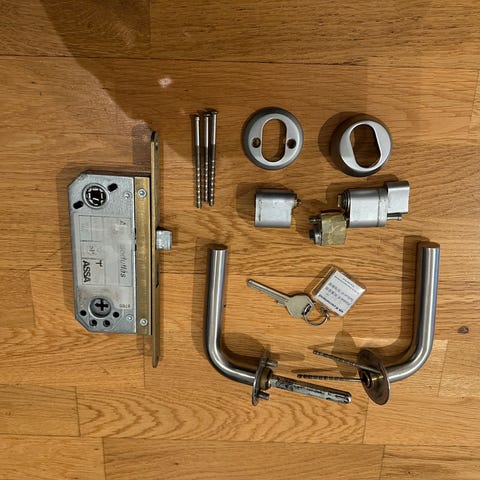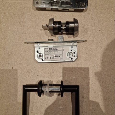 Intelligent Lock elektronisk dørhåndtak i svart farge. Produktet inkluderer mekaniske og elektroniske komponenter for adgangskontroll. Passer for standard dørinstallasjon med mål som vist på medfølgende monteringsmal. Materiale og tekniske spesifikasjoner er tilpasset for sikker og praktisk bruk.