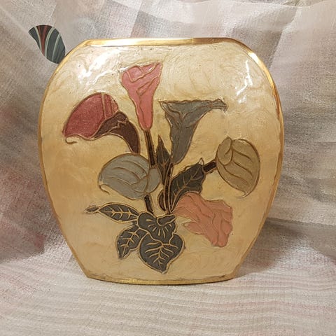 Dekorativ liten vase i messing med emalje, vakkert dekorert med blomster- og planteornamenter. Vasen passer perfekt som interiørdetalj – alene eller med tørkede blomster.