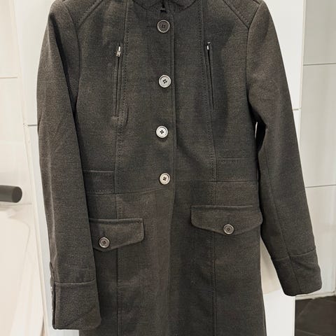 Kåpe i mørkeblå farge, størrelse 42 for dame. Laget av polyester materiale. Jakken har knapper foran og mansjetter med knappedetaljer. Før pris 1400
