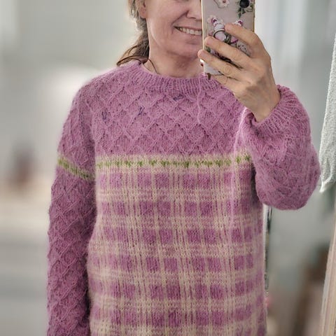 Er ny strikket😊garn prisen er 1190.(14 nøster.denne litt mere da medium lengde) 🫣.jeg er en erfaren strikker.😊strikket mange skappel gensere😊kan strikke noe annet av dorthe om ønskelig.(1000kr for strikkingen)😊i orginalen er det bare striper under armene.jeg syns det er mindre pent.så har samme mønster under armene som på sidene