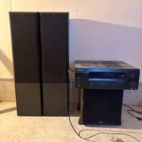 Elegant minianlegg med cd/dvd aux fmradio og forsterker med utgang for subwoofer og to høyttalere. Jeg er ikke sikker på om det fungerer, jeg kan ikke sjekke det. Kjøp og sjekk selv. Hvis det ikke passer, kan du returnere det uten problemer.