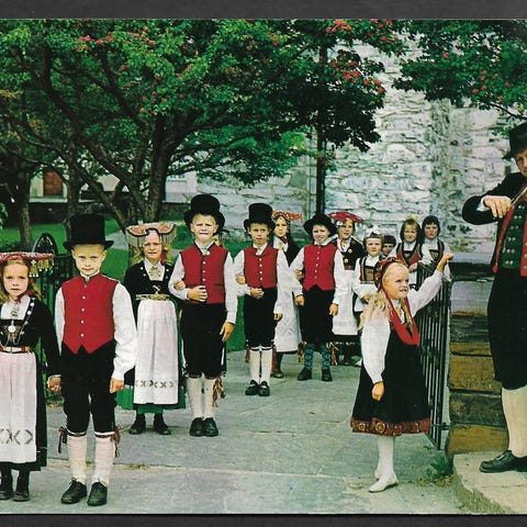Postkort i svart-hvitt som viser både barn og voksne i ulike bunader. Pent, ubrukt storformat, se bilder
