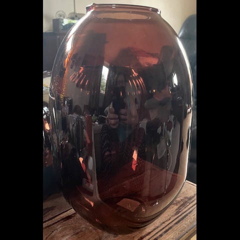 Kremmerhuset dekorasjonsvase laget i keramikk med to håndtak. Vasen har en rund form og en brunfarget glasur med et flekket mønster. Egnet for innendørs dekorasjon.