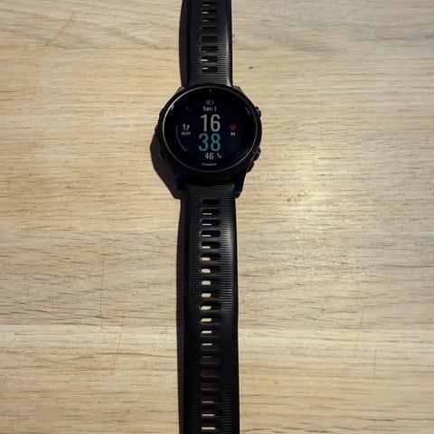 Garmin Forerunner 735 GPS-smartklokke med svart reim. Klokken har innebygd GPS og pulsmåler, og er designet for trening og aktivitetsmåling. Reimen er justerbar og laget av slitesterkt materiale.
