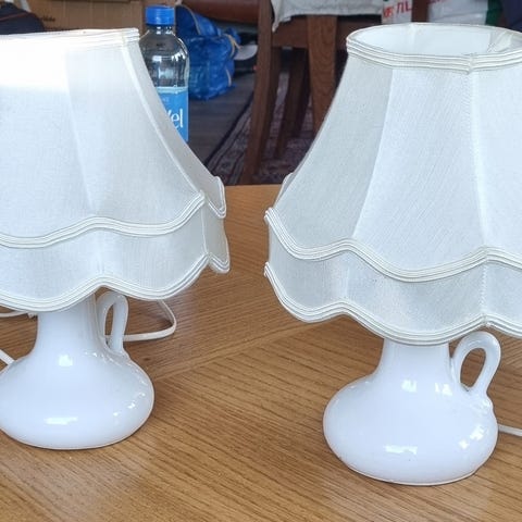 2 Stk lamper i messing og hvit opalin skjerm med bølgete kant. selges samlet eller hver for seg hbo 600.- pr stk. Mål på lampe 35cm 21 cm diameter på skjerm. Sender, pakker godt.